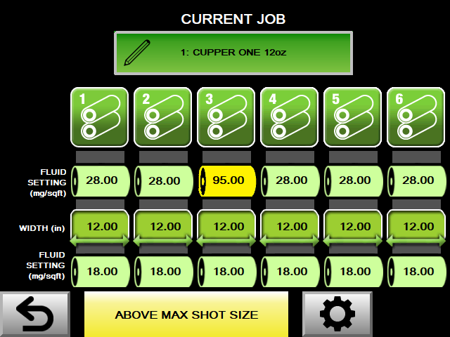 The APEX™ system utilizes a positive displacement pump and a precisely controlled stepper motor to supply fluid to a Uni-Roller® S2. If a fluid setting is entered that exceeds the maximum shot size, the APEX™ will display a warning banner on the Job Edit screen and highlight the roller(s) that surpasses the maximum shot size. If this job is saved by navigating back to the Job Manager screen, the APEX™ will operate at the maximum shot size, potentially resulting in inadequate fluid application.