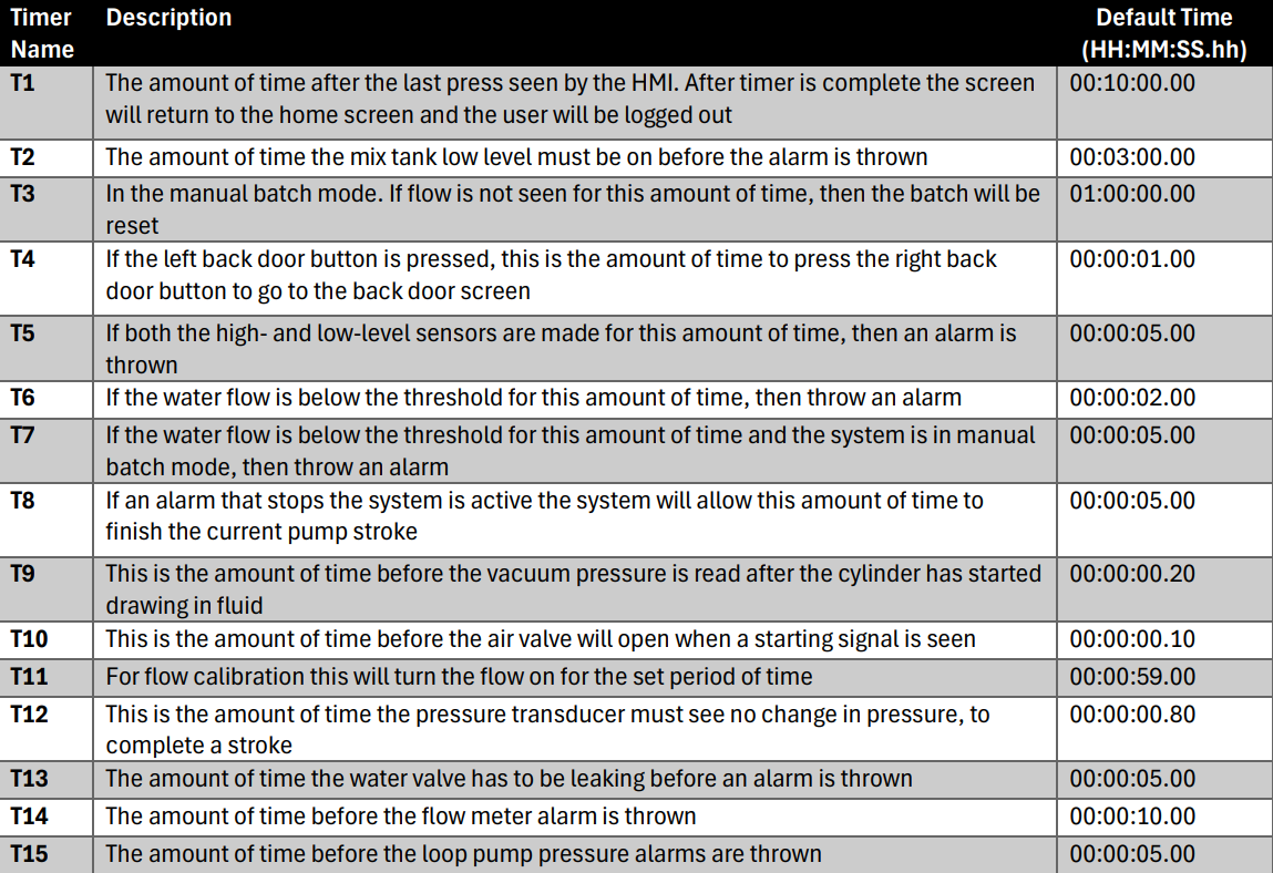 The timers can be adjusted by going to the Timers screen. From the Menu screen, go to the Factory settings screen and then to the parameters screen. From there, press the stopwatch icon to go to the Timers screen.