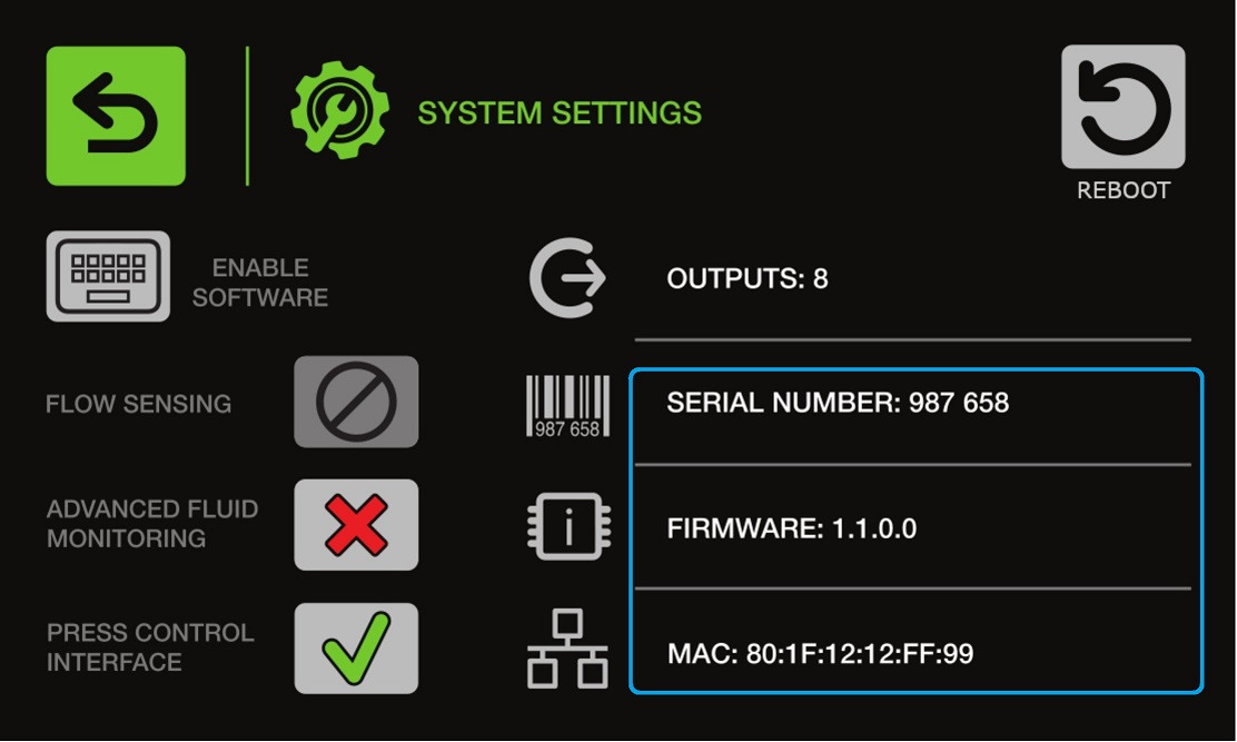The number of outputs, serial number, firmware version, and MAC address of the SmartFlow®controller can be found as shown below.
