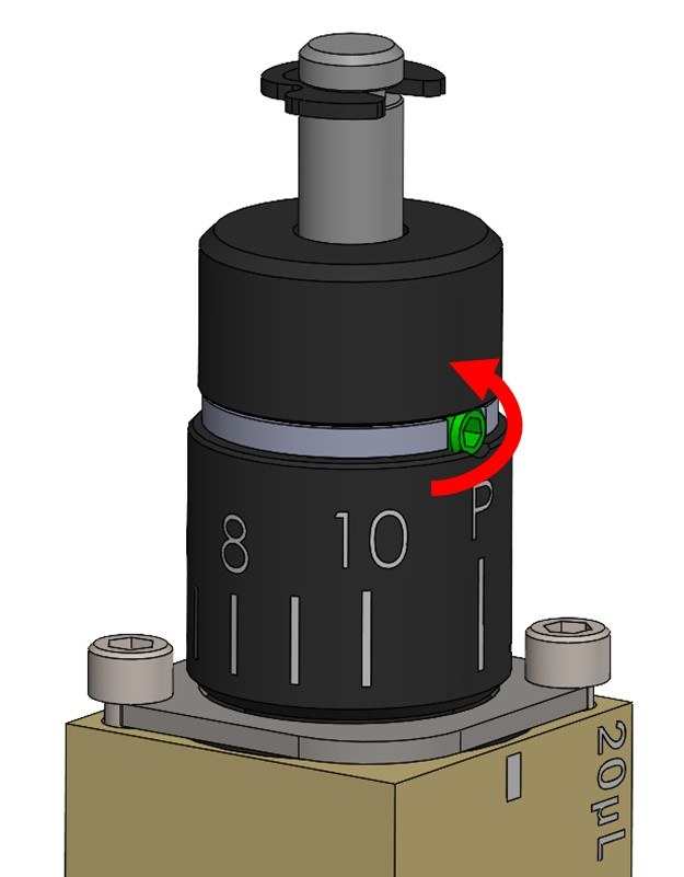 The adjustment knob on a 230 Micro Pump can be locked into place by using a 1/16” allen wrench to tighten the set screw on the adjustment knob. Tighten the screw ~1/2 to 3/4 of a turn (clockwise) until it bottoms out, but do not over tighten as overtightening may strip the threads or cause damage to the internals of the adjustment knob. If the adjustment knob needs to be turned, loosen the set screw ~1/2 to 3/4 of a turn counterclockwise. Backing the set screw out too far could allow the adjustment knob to fully thread apart.