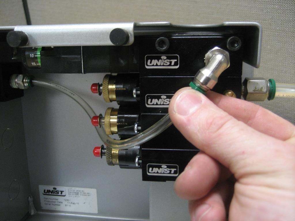 Next, disconnect the fluid outlet connections from the pump. For tips on working with coaxial type tubing reference this video.