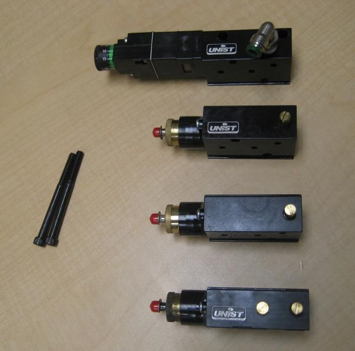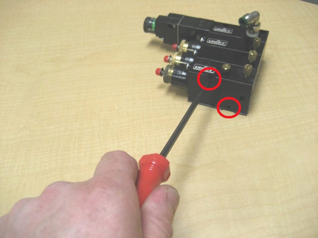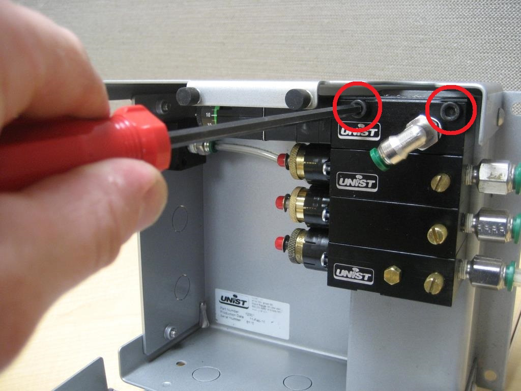With the pump stack removed from the enclosure the two retaining screws can be removed and the pump stack pulled apart. Note that the pump stack shown uses two socket head cap screws. Taller pump stacks will use a threaded rod with a brass cap nut to retain the stack together.