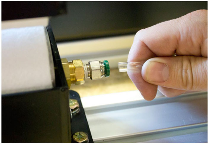 Remove the tubing from the push-to-connect fitting on the dispenser tube.