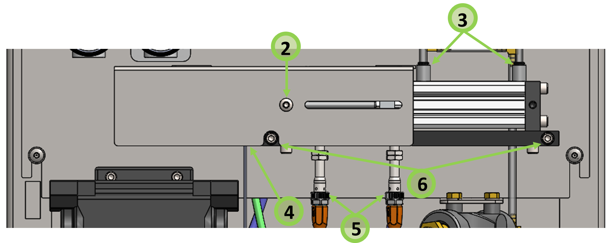 - Remove the 2 push-to-connect fittings using a 5/64 hex key.