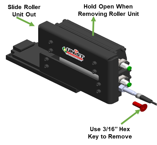 - Remove the 5/16"-18 mounting screw that holds the roller unit to the base.