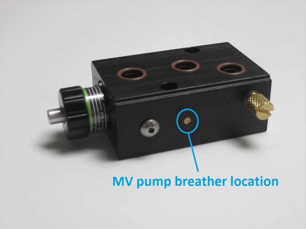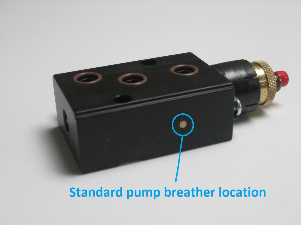 Fluid spraying from the breather on an MV pump is relatively easy to observe as the breather is located on the front of the pump and is visible while the pump is assembled inside of an enclosure. The breather on a standard pump is located on the back of the pump and usually cannot be seen if the pump is installed in an enclosure. This type of leak is often observed as fluid in the bottom of the reservoir and a trail of fluid down the bracket that the pump stack mounts to. To properly diagnose a pump breather leak on a standard pump, the pump stack may have to be removed from its mounting bracket and the pump(s) cycled while observing the breather port for signs of fluid.