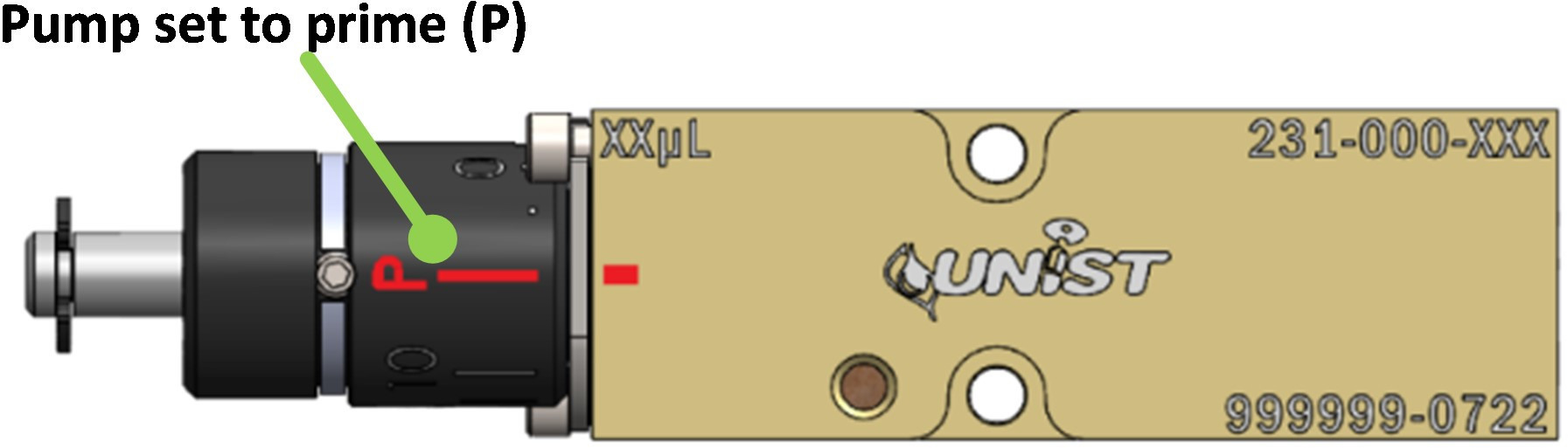 The “P” indicates the preferred priming position. All 230 Micro Pumps are self-priming and capable of drawing a vacuum, but the adjustment knob must be turned with the “P” aligned to the mark on the pump body to confirm it is set to the priming position.