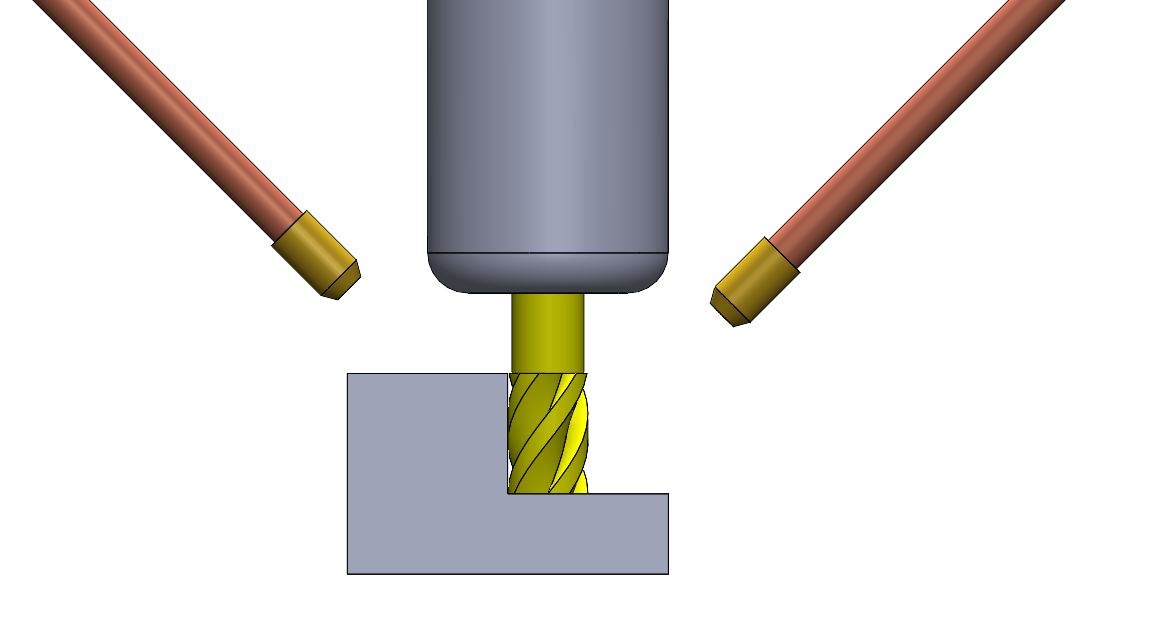 There are instances when using a Coolubricatorâ„¢ or Serv-O-Sprayâ„¢, when it would be beneficial to use two nozzles as opposed to just one for good tool lubrication coverage. For most typical drilling, milling, and turning operations, one nozzle will suffice for proper coverage of the cutting tool. In instances where one nozzle may become shielded from the cutting tool by the workpiece or other obstruction, it can be helpful to have a second nozzle aimed at the other side of the tool. This can happen when milling deep pockets or if fixturing blocks spray from a nozzle. In the example shown below, if the tool is moving right to left, the output from the nozzle on the left is shielded from the cutting tool by the workpiece. In this case, it would be advantageous to spray from the nozzle on the right to ensure consistent lubrication of the cutting tool.